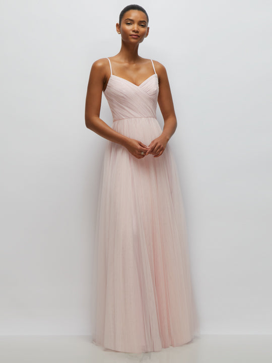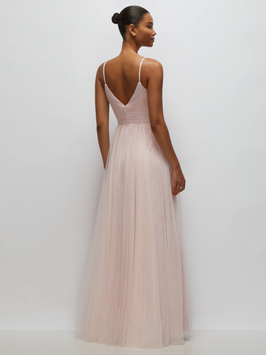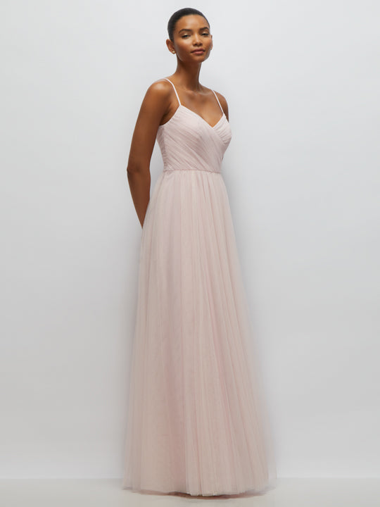 This neu tulle maxi dress is pure ethereal perfection, featuring a flowing, full, shirred skirt that creates effortless movement with every step. The ruched surplice bodice and fitted waist beautifully sculpt your silhouette, while delicate spaghetti straps frame a graceful v-neckline and back. This romantic tulle dress is the ultimate pick for those standout occasions where elegance meets a hint of magic.