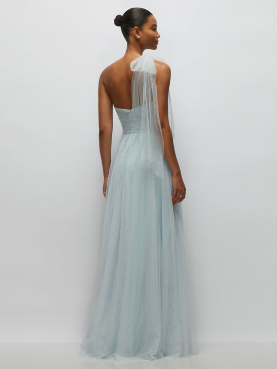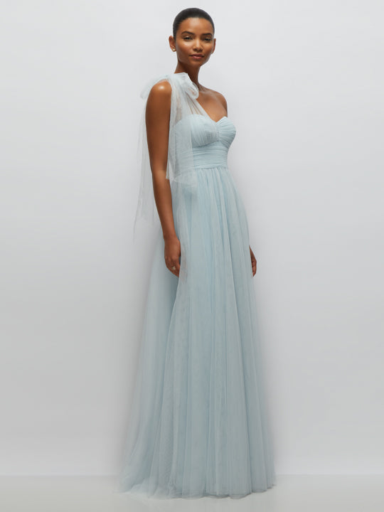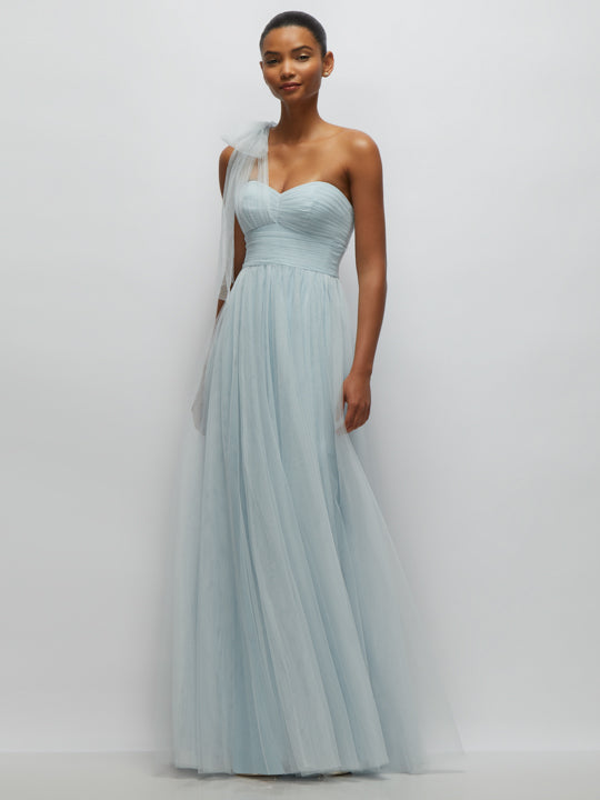 This airy neu tulle gown exudes an ethereal romance with its soft layers of tulle and delicate pastel hue. The one-shoulder design features a sheer tulle bow that cascades gracefully, adding a whimsical touch, while the strapless pleated bodice flatters with a figure-enhancing shape. Flowing into a dreamy, floor-length full skirt, this dress is a vision of soft elegance—perfect for moments that call for a truly magical look.