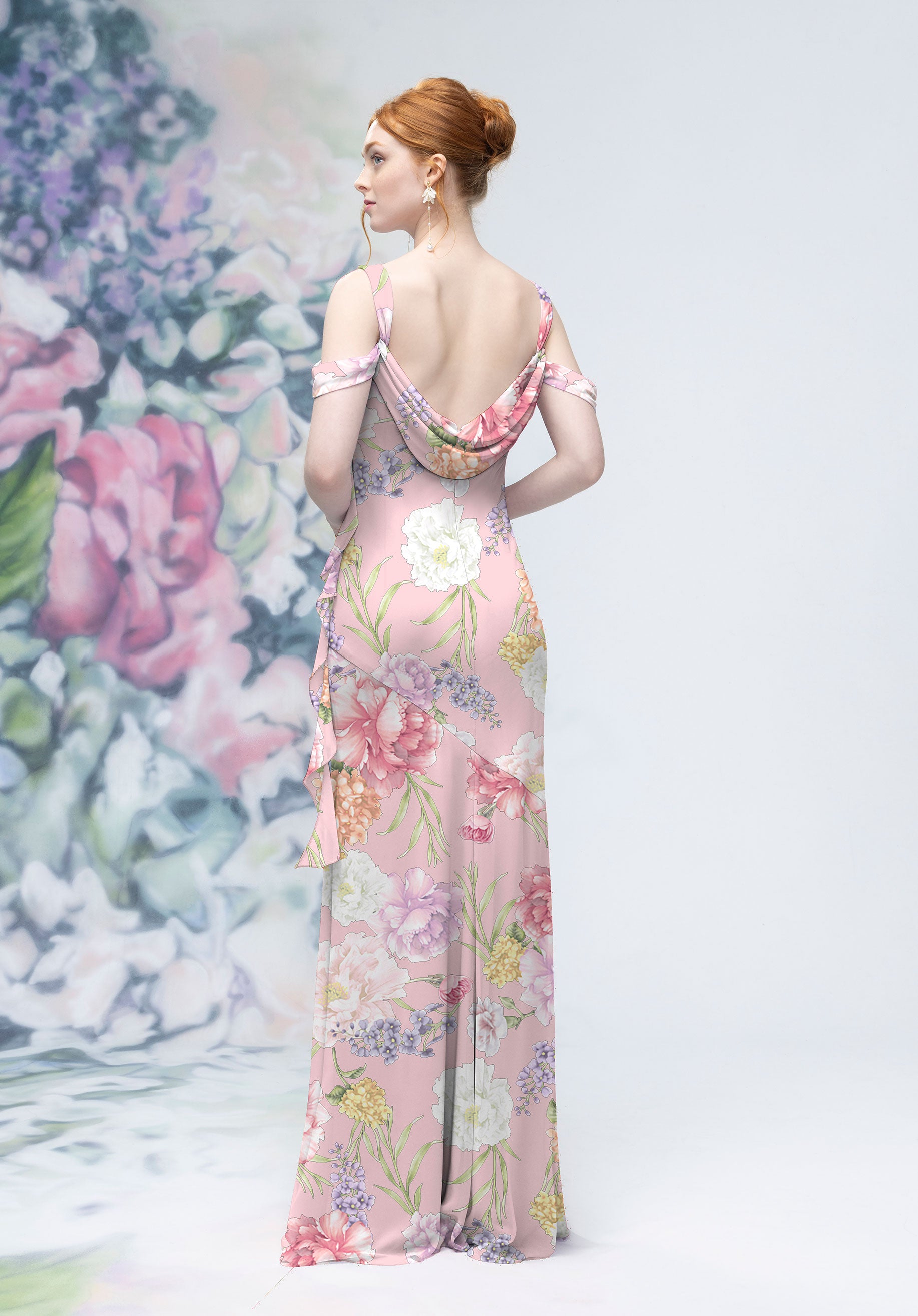 Bias cut bridesmaid dress has a soft scoop neckline with cowl detail and draped cowl back with cold shoulder straps accented by cascading ruffle bows in floral printed chiffon. Dress is available in one color pattern only - Rose/Violet/Pink.