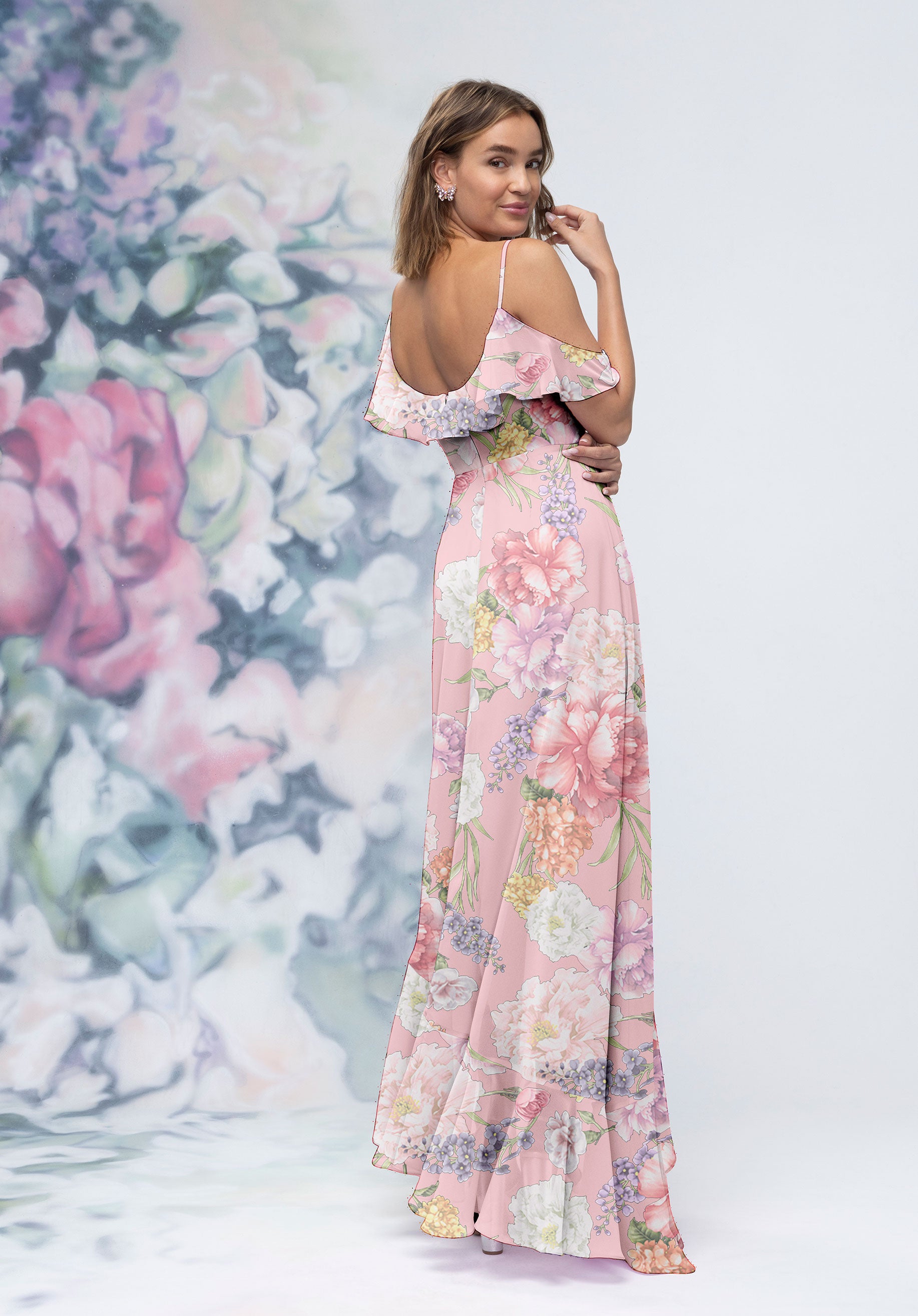 Floral printed chiffon A-line bridesmaid dress has a surplice bodice with asymmetrical ruffle details, cold-shoulder and flutter sleeve, and a cascading ruffle skirt slit. Dress is available in one color pattern only - Rose/Violet/Pink.