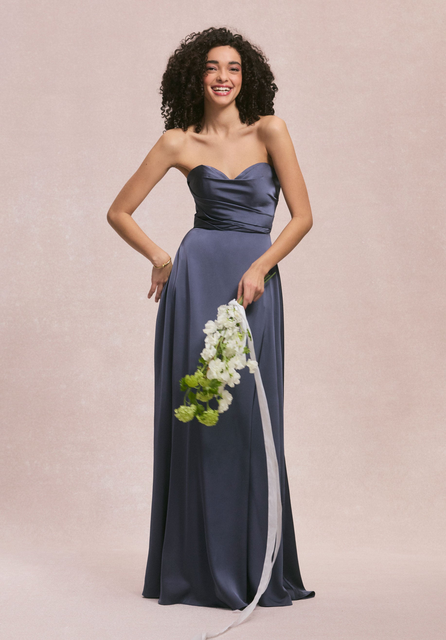 Cut from luminous luxe satin, this A-line bridesmaid dress features a soft scoop neckline and artfully draped bodice for a look that’s both clean and romantic. The fluid skirt glides effortlessly and is finished with pockets for an unexpected detail. Shown in Dusk.