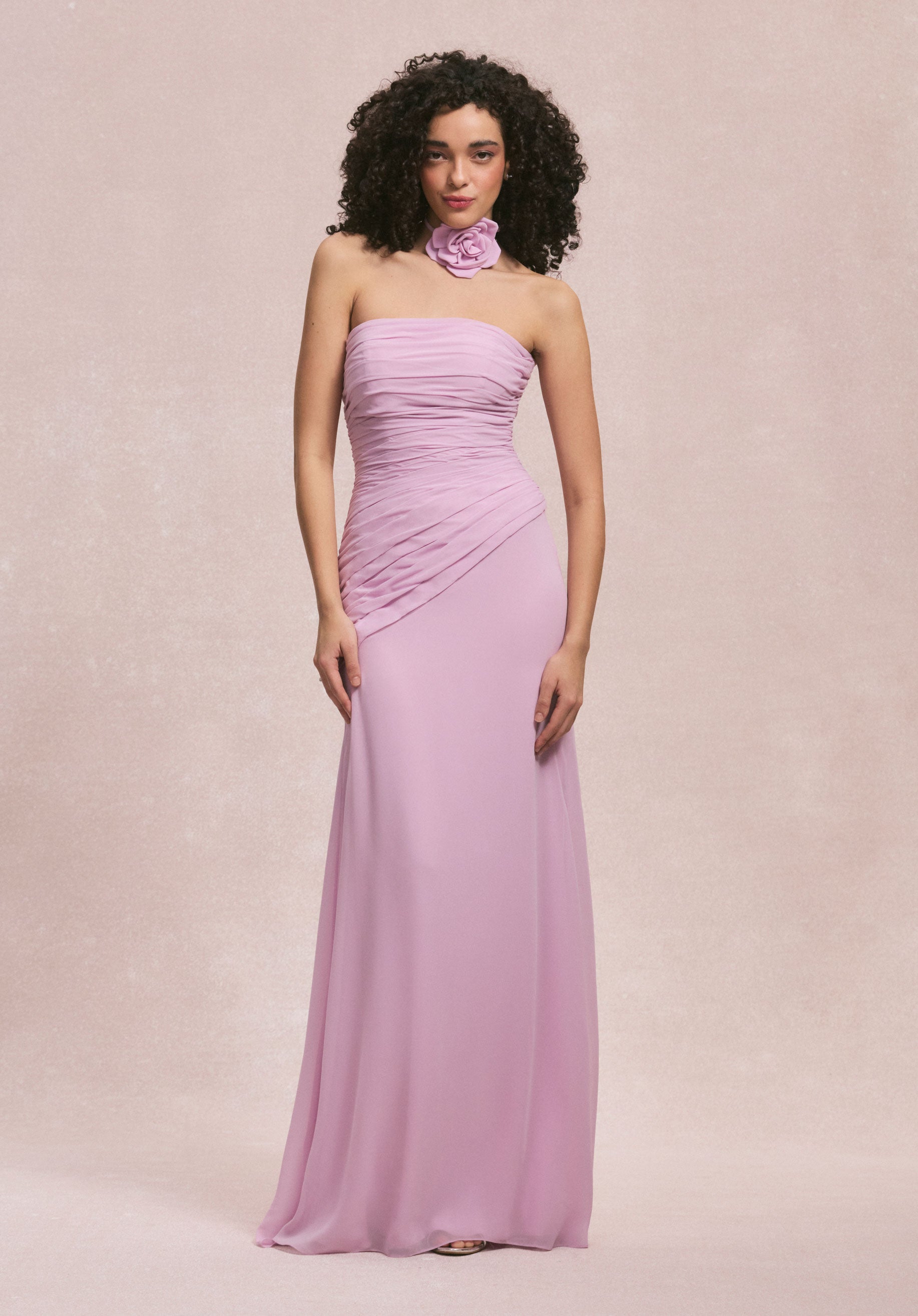 Soft structure with a romantic twist, this strapless chiffon bridesmaid dress features an asymmetrical dropped waist that elongates the silhouette with subtle sophistication. The flowing skirt offers graceful movement, while a detachable floral tie adds a customizable touch of whimsy. Shown in Blossom.